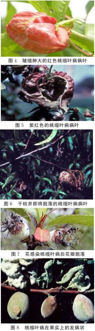 桃縮葉病在桃樹的枝干、葉片和花器及果實上均可表現(xiàn)出癥狀(圖1)。